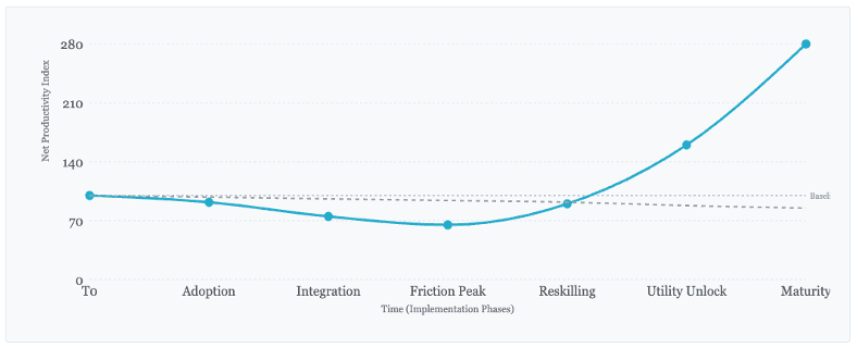 Figure 2. The Productivity J-Curve vs. The Stagnation Counterfactual. The cyan line represents the "Symbiotic Path" (Stage 3 Utility), showing the characteristic initial decline during reskilling and capital investment (The Valley of Friction) before exponential gains. The dashed line illustrates the slow decline of institutional competitiveness in firms that fail to bridge the "Redundancy Wall”.