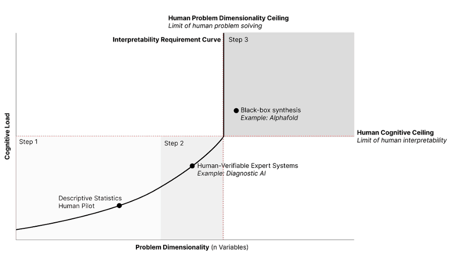 The Intelligence Frontier (C): Problems of extreme dimensionality, such as Black-box synthesis (e.g., AlphaFold), reside in a regime where the required cognitive load exceeds the human ceiling. In this region, AI acts as an "Oracle," providing high-utility, verifiable outcomes that are nonetheless mechanistically opaque to human observers.